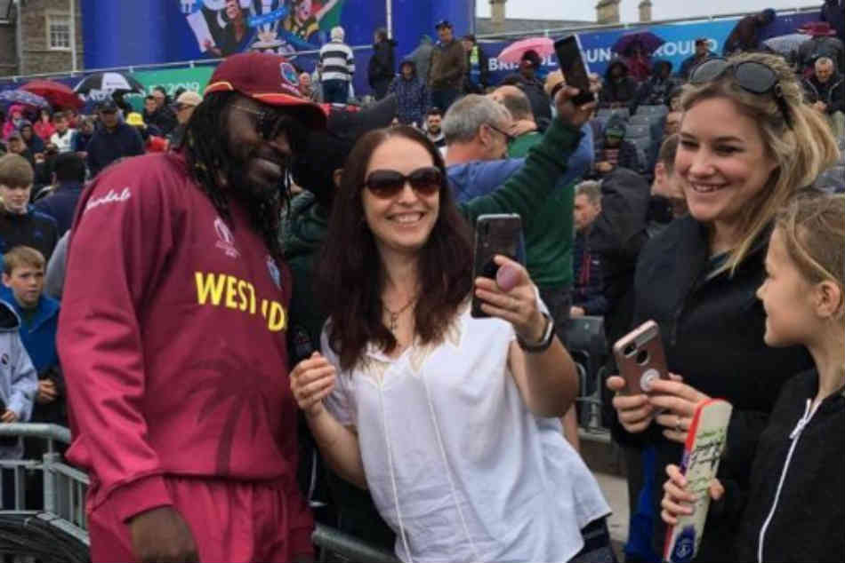 మ్యాచ్ మధ్యలో చిన్నపాటి చిరుజల్లులు పడుతున్న సమయంలో వెస్టిండిస్ విధ్వంసకర బ్యాట్స్మన్ క్రిస్ గేల్ డ్రెస్సింగ్ రూమ్కు వెళ్లకుండా అభిమానులతో కలిసి సందడి చేశాడు. ఈ సందర్భంగా పలువురు అభిమానులు గేల్తో ఆటోగ్రాఫ్లు తీసుకునేందుకు ఎగబడతారు. గేల్ సైతం అభిమానులతో సెల్ఫీలు దిగాడు.