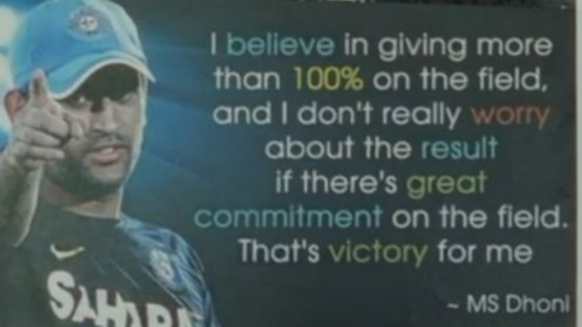 'మైదానంలో వంద శాతం కన్నా ఎక్కువ కష్టపడాలని నేను నమ్ముతా. మైదానంలో అంత గొప్ప కమిట్మెంట్ చూపిస్తే మ్యాచ్ ఫలితం ఎలా ఉన్నా నేను పెద్దగా పట్టించుకోను. ఆ కమిట్మెంట్ చూపించడమే నా దృష్టిలో విజయం' అని ఎంఎస్ ధోనీ ఒకానొక సందర్భంలో చెప్పాడు. ఈ కొటేషన్ ఉన్న పోస్టర్ను అరుణ్ జైట్లీ స్టేడియంలో టీమిండియా డ్రెస్సింగ్ రూంలో ఉంచారు.