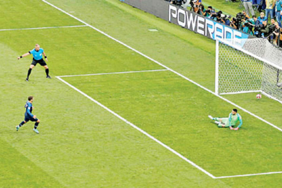 గ్రీజ్మన్ గోల్ పోస్ట్ వైపు కిక్ కొట్టగా.. మటౌడి హెడర్ కోసం ప్రయత్నించినప్పటికీ, దానిని ప్రత్యర్ధి గోల్ పోస్టులోకి కొట్టలేకపోయాడు. ఈ క్రమంలో బంతి పెరిసిచ్ చేతికి తగిలింది. అయితే పెరిసిచ్ చేతితో బంతిని అడ్డుకున్నాడని రిఫరీ పెనాల్టీ ఇచ్చేశాడు. తొలుత పెనాల్టీకి అంగీకరించని రిఫరీ ‘వీఏఆర్' ద్వారా సుదీర్ఘ సమయం తీసుకొని దానిని నిర్ధారించడం వివాదాస్పదమైంది. పెరిసిచ్ చేతికి బంతి తగలడం వాస్తవమే అయినప్పటికీ, అది ఉద్దేశ పూర్వకంగా చేయలేదనే క్రొయేషియా ఆటగాళ్ల వాదన చెల్లలేదు.