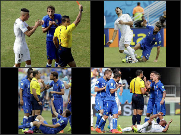 ఇటలీ ఆటగాడు ఆండియా బర్జలి గోల్ చేసేందుకు ప్రయత్నించగా ఉరుగ్వే ఆటగాడు లూయిస్ సురెజ్ కిందపడిపోతున్న దృశ్యం.