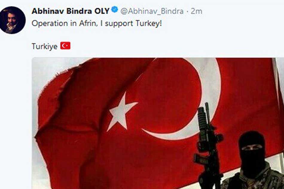 అందులో ఒకటి 'ఆపరేషన్ ఇన్ ఆఫ్రిన్, ఐ సపోర్టు టర్కీ' అని పేర్కొన్నారు. అభినవ్ బింద్రా అకౌంట్ హ్యాక్ కావడంతో తాత్కాలికంగా దానిని నిలుపుదల చేశారు. అయితే, ఈ విషయంలో బాధితుడు బహిరంగంగా ఎలాంటి ప్రకటన చేయకున్నా కొన్ని వారాల కిందట కూడా ఇలాగే అతని ట్విట్టర్ అకౌంట్ హ్యాక్ అయిన విషయం తెలిసిందే.
