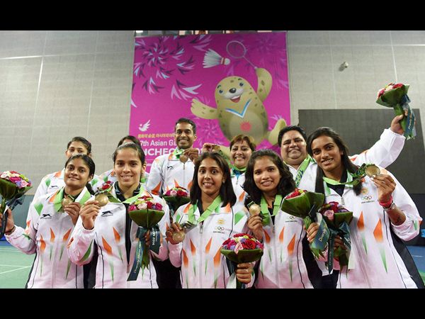 దక్షణ కొరియాలోని ఇంచియాన్లో జరుగుతున్న 17వ ఆసియా గేమ్స్లో కాంస్య పతకాన్ని గెలుచుకున్న ఉమెన్స్ బ్యాడ్మింటన్ జట్టు. వరుసగా సైనా నెహ్వాల్, పివి. సింధు, పిసి తులసి, అశ్విన్ పొన్నప్ప, సిక్కిరెడ్డి, ప్రద్న్య గద్రే.
