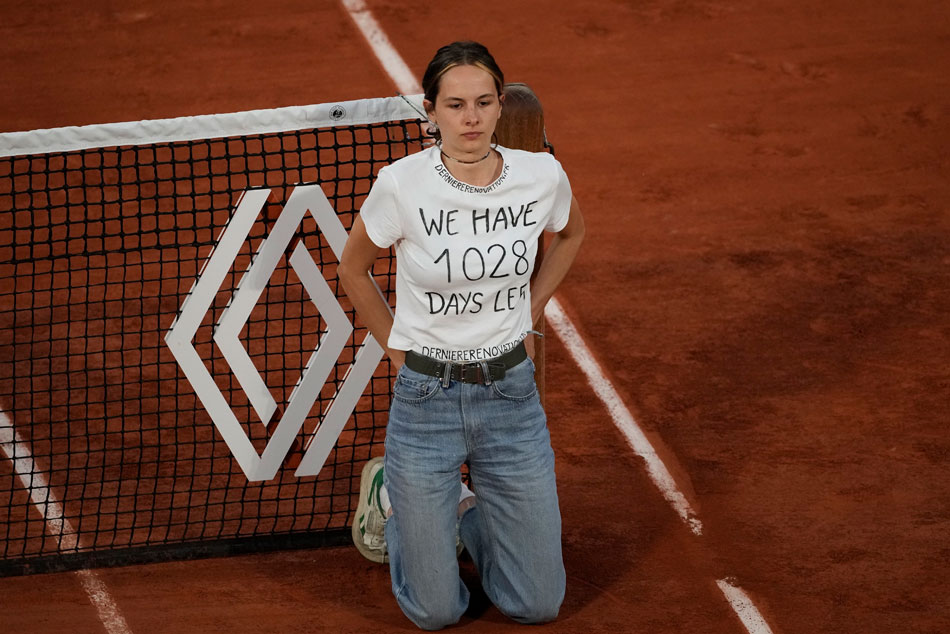 పారిస్: ఫ్రెంచ్ ఓపెన్ 2022 సెమీఫైనల్ మ్యాచ్ను అడ్డుకొని ఓ మహిళా తన నిరసన వ్యక్తం చేసింది. కాస్పర్ రూడ్ (నార్వే), సిలిచ్ (క్రొయేషియా) మధ్య గురువారం ఫిలిప్ చార్టియర్ కోర్ట్లో జరిగిన పురుషుల సింగిల్స్ రెండో సెమీఫైనల్లో ఈ ఘటన చోటు చేసుకుంది. మ్యాచ్ హోరాహోరీగా జరుగుతుండగా.. సదరు మహిళ కోర్ట్లోకి దూసుకొచి తనను తానే కట్టేసుకుంది. ఇనుప వైర్లతో ఆమె నెట్కు ముడులు వేసుకున్నది. ఈ ఊహించని ఘటనతో సుమారు 13 నిమిషాల పాటు మ్యాచ్ నిలిచిపోయింది.